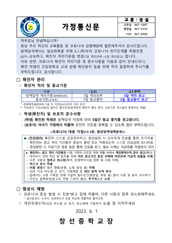 정부의 코로나19 방역 대응체계가 6.1.(목)부터 '경계단계'로 완화됨에 따라 학교현장 및 교육청 의견 수렴과 전문가, 방역당국의 협의를 거쳐 개정된 사항을 안내드리오니 적극 동참하여주시길 부탁드립니다.
